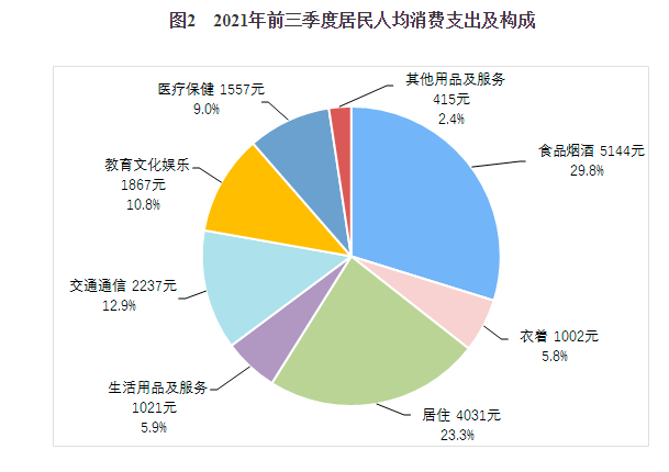 而全国居民消费支出位于前三的消费支出分别是人均食品烟酒消费支出、人均居住消费支出、人均交通通信消费支出。其中人均居住消费支出4031元,增长7.9%,占人均消费支出的比重为23.3%,位于全国居民消费支出第二。