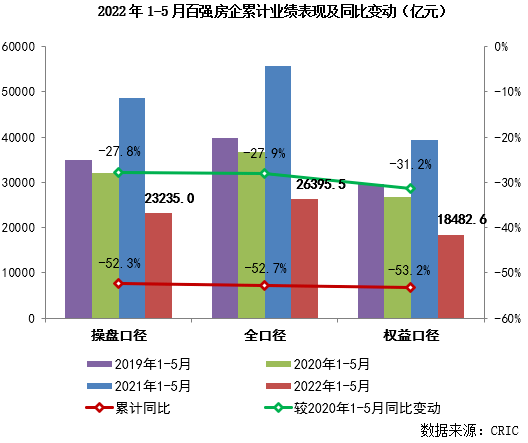 根据克而瑞研究中心报告,TOP100房企5月份实现销售操盘金额4546.7亿元,环比增长5.6%,同比降低59.4%,降幅仍保持较高水平。累计业绩方面,百强房企前5月整体操盘业绩规模同比降低52.3%,降幅较上月进一步扩大。