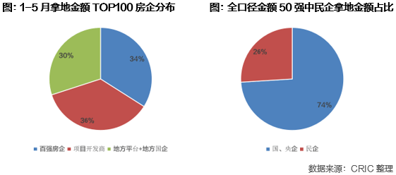 从1-5月拿地金额TOP100房企来看,百强房企拿地数量仅占到34%,几乎全部集中在销售TOP50企业之中。建发、华润、中海、万科等房企,1-5月份拿地金额超过200亿元。此外,项目开发商和地方平台公司个占到36%和30%。