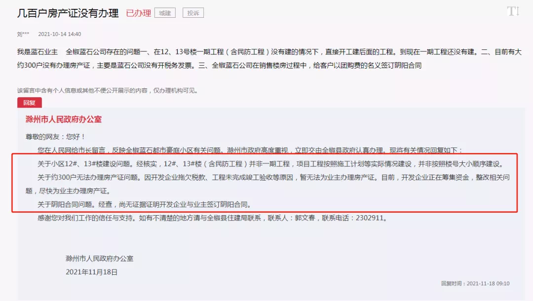 滁州一楼盘约300户房产证无法办理!官方答复!