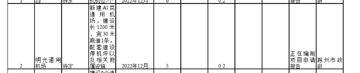 在《安徽省2022年重点项目投资计划》中提及新建项目中提及明光通用机场预计今年12月开建。
