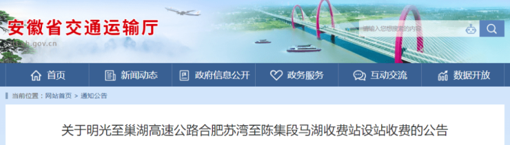 9月4日,安徽省交通运输厅网站发布公告,明巢高速合肥苏湾至陈集段马湖收费站于2023年9月6日开通,并对过往车辆收取通行费。具体内容如下: