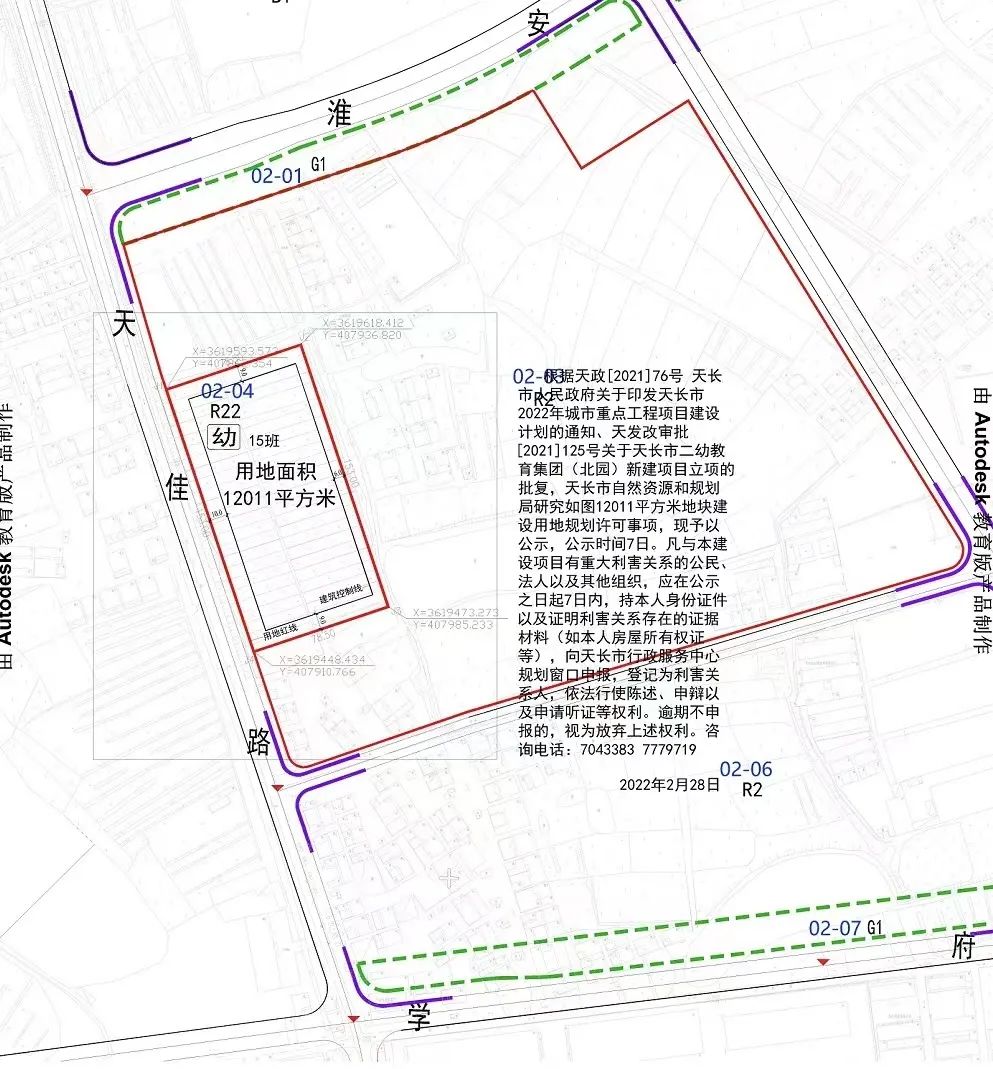 根据天政[2021]76号天长市人民政府关于印发天长市2022年城市重点工程项目建设计划的通知、天发改审批[2021]125号关于天长市二幼教育集团(北园)新建项目立项的批复,天长市自然资源和规划局研究如图12011平方米地块建设用地规划许可事项,现予以公示,公示时间7日。