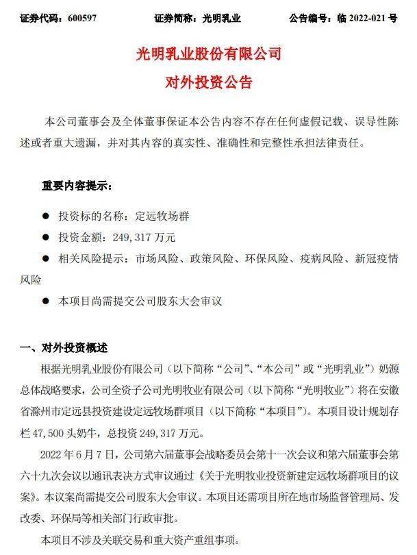 6月7日晚间,光明乳业(600597)发布公告,全资子公司光明牧业有限公司(以下简称光明牧业)拟在安徽省滁州市定远县投资建设定远牧场群项目。