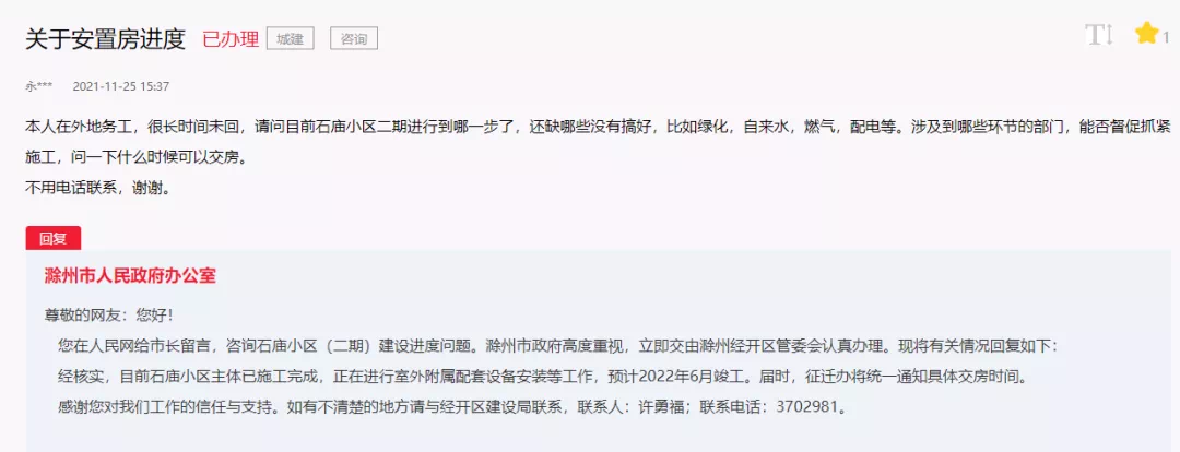 问 本人在外地务工,很长时间未回,请问目前石庙小区二期进行到哪一步了,还缺哪些没有搞好,比如绿化,自来水,燃气,配电等。涉及到哪些环节的部门,能否督促抓紧施工,问一下什么时候可以交房。 答 尊敬的网友:您好! 您在人民网给市长留言,咨询石庙小区(二期)建设进度问题。滁州市政府高度重视,立即