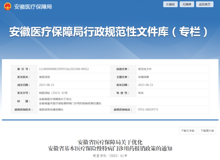 8月23日,安徽省医疗保障局网站发布《安徽省医疗保障局关于优化安徽省基本医疗保险慢特病门诊用药报销政策的通知》,全文如下: