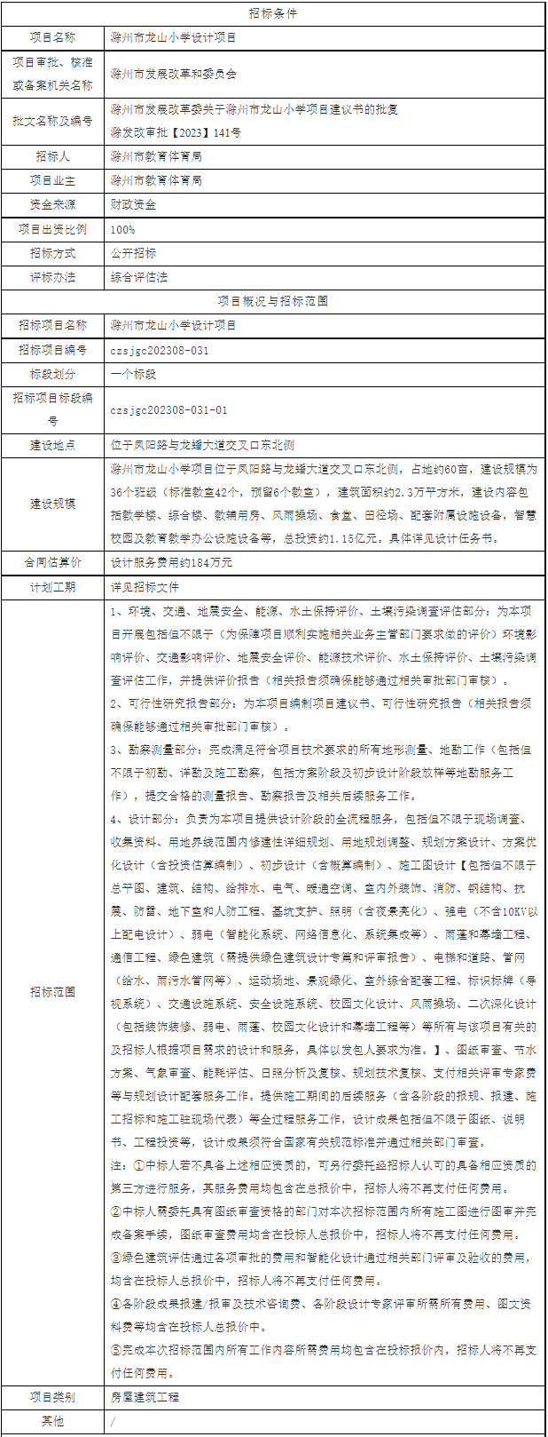 滁州市龙山小学设计项目招标公告信息(电子招标投标)