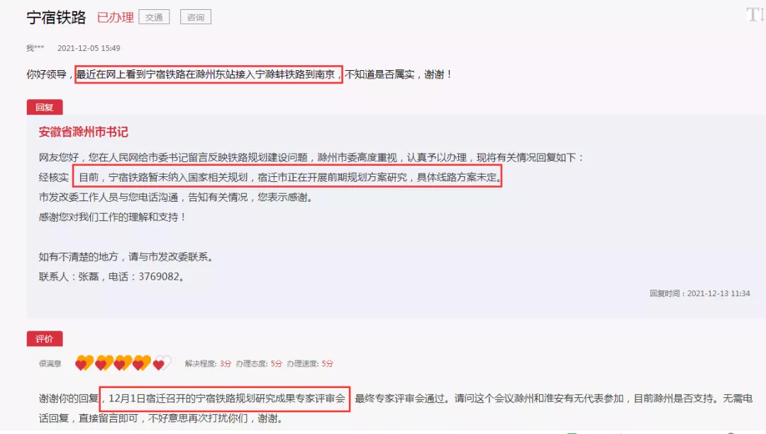 网友您好,您在人民网给市委书记留言反映铁路规划建设问题,滁州市委高度重视,认真予以办理,现将有关情况回复如下: