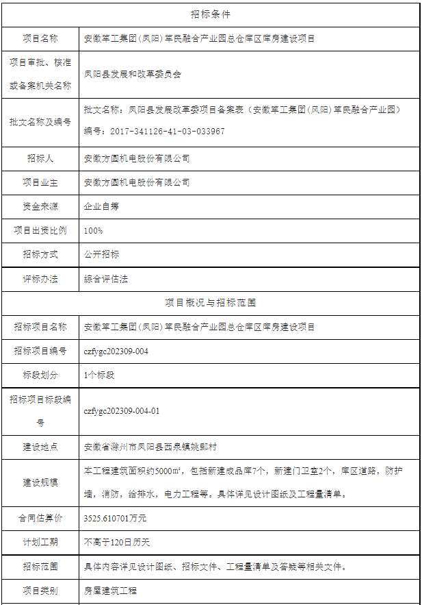 安徽军工集团(凤阳)军民融合产业园总仓库区库房建设项目招标公告信息(电子招标投标)建设地点:安徽省滁州市凤阳县西泉镇姚郢村建设规模:本工程建筑面积约5000㎡,包括新建成品库7个,新建门卫室2个,库区道路,防…
