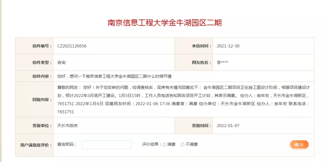 网友咨询: 您好,想问一下南京信息工程大学金牛湖园区二期什么时候开建? 天长市政府回复: 您好!关于您反映的问题,经调查核实,现将有关情况回复如下:金牛湖园区二期项目正在施工图设计阶段,根据项目建设计划,预计2022年3月底开工建设。 来源:滁州市人民政府官网