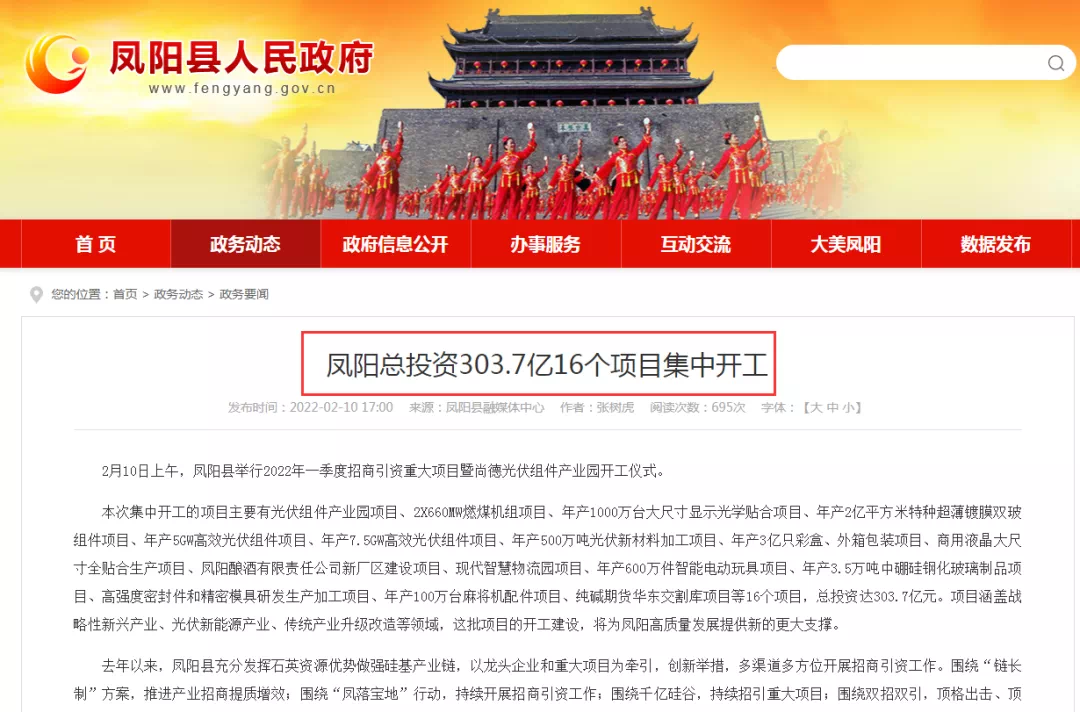 2月10日上午,凤阳县举行2022年一季度招商引资重大项目暨尚德光伏组件产业园开工仪式。