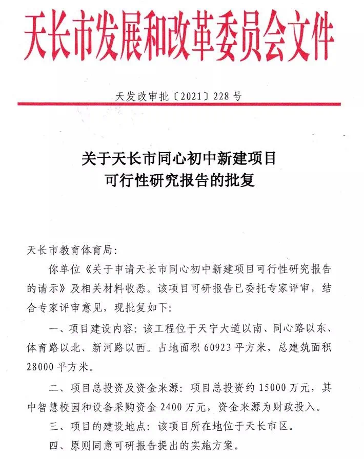 关于天长市同心初中新建项目可行性研究报告的批复 天长市教育体育局: 你单位《关于申请天长市同心初中新建项目可行性研究报告的请示》及相关材料收悉。该项目可研报告已委托专家评审,结合专家评审意见,现批复如下: