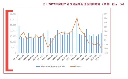 数据显示,从房地产开发到位资金来看,2021年1-12月,房地产开发企业到位资金201132亿元,同比增长4.2%,规模创历史新高,但增速创近六年新低且增速逐月下滑,2021年下半年起到位资金单月值同比出现负增长,9月同比降幅达到11.2%。2021年四季度政策密集发声后,年末到位资金增速仍表现不佳,12月单月到位资金17770亿元,同比下降19.3%,单月到位资金规模低于历史同期,同比增速创近五年新低。
