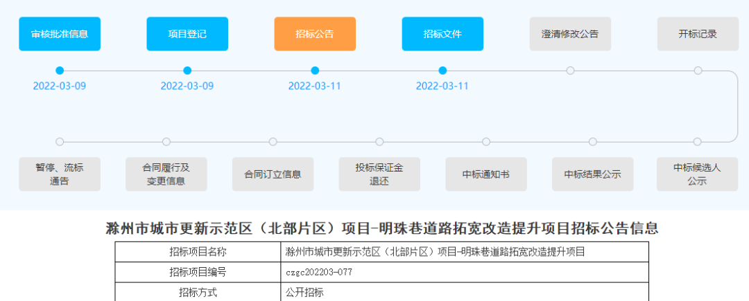 滁州市城市更新示范区(北部片区)项目-明珠巷道路拓宽改造提升项目,主要施工内容为道路整治改造,项目投资额约902万元。 来源:滁州市公共资源交易中心