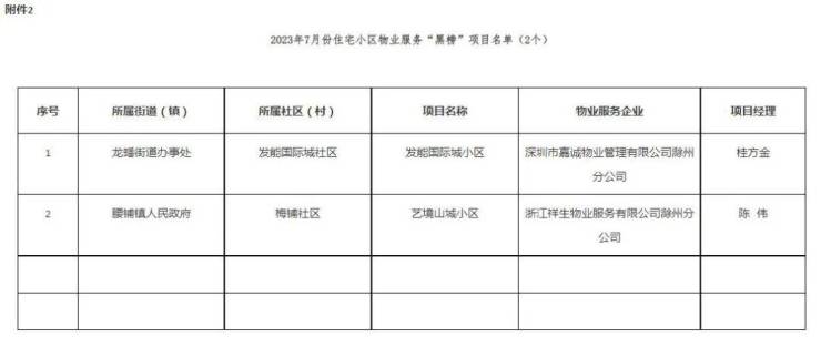 为加强物业服务企业监管,提升物业服务水平,按照《滁州市物业服务企业信用档案管理实施细则》(建物〔2021〕62号)和《关于修订建立住宅小区物业服务项目“红黑榜”制度的通知》( 南建字〔2023〕2号)有关规定,结合各乡镇、街道月度考核和物业服务日常监督管理情况,将滁州臻美物业管理有限公司等3个物业服务项目列入“红榜”( 附件1 ),将浙江祥生物业服务有限公司滁州分公司等2个物业服务项目列入“黑榜”( 附件2),现予以通报。