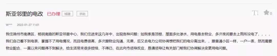 问:住滁州市南谯区,杨明南路的斯亚邻里中心,我们住进来这几年中,出现各种问题:如我家是顶楼,屋面多处渗水,用电是去物业,多次夜间要去上厕所没电了,,,,我们自己看不到电表,掌握不了用电情况,而且电费很高,多次跟物业沟通,无果,后又去电力公司协调想把我们的电分离出来,,跟普通小区一样,一户一表,然而需要物业配合,一直以来问题得不到解决,给生活带来很多烦恼,不得已,在此向市领导反应,恳请领导让有关部门帮我们协调解决变更用电问题。