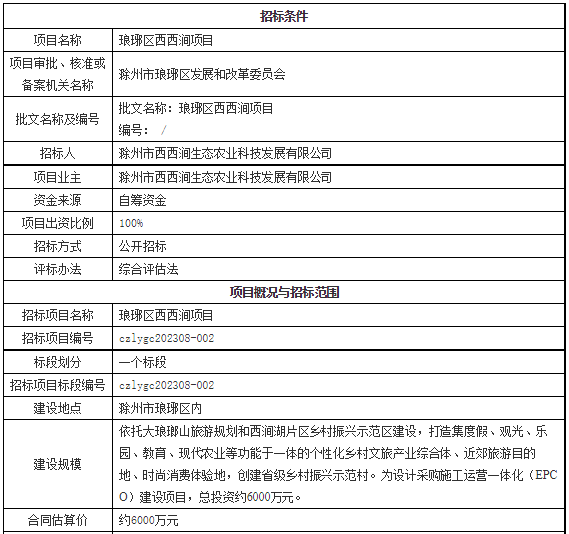 琅琊区西西涧项目招标公告信息(电子招标投标)建设规模:托大琅瑯山旅游规划和西涧湖片区乡村振兴示范区建设,打造集度假、观光、乐园、教育、现代农业等功能于一体的个性化乡村文旅产业综合体、近郊旅游目的地、时尚消费体…