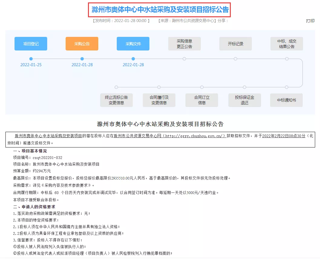 项目名称:滁州市奥体中心中水站采购及安装项目