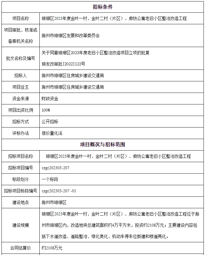 一、琅琊区2023年度金叶一村、金叶二村(片区)、麻纺公寓老旧小区整治改造工程招标公告信息