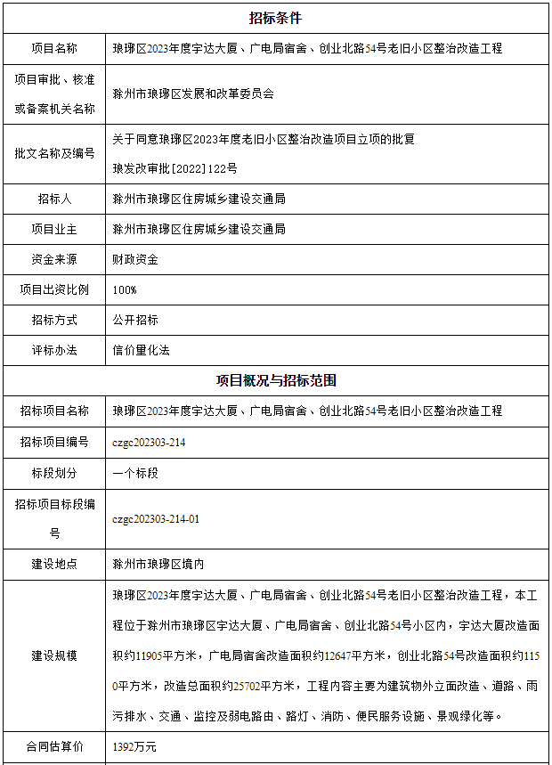琅琊区2023年度宇达大厦、广电局宿舍、创业北路54号老旧小区整治改造工程,本工程位于滁州市琅琊区宇达大厦、广电局宿舍、创业北路54号小区内,宇达大厦改造面积约11905平方米,广电局宿舍改造面积约12647平方米,创业北路54号改造面积约1150平方米,改造总面积约25702平方米,工程内容主要为建筑物外立面改造、道路、雨污排水、交通、监控及弱电路由、路灯、消防、便民服务设施、景观绿化等。合同估算价1392万元。