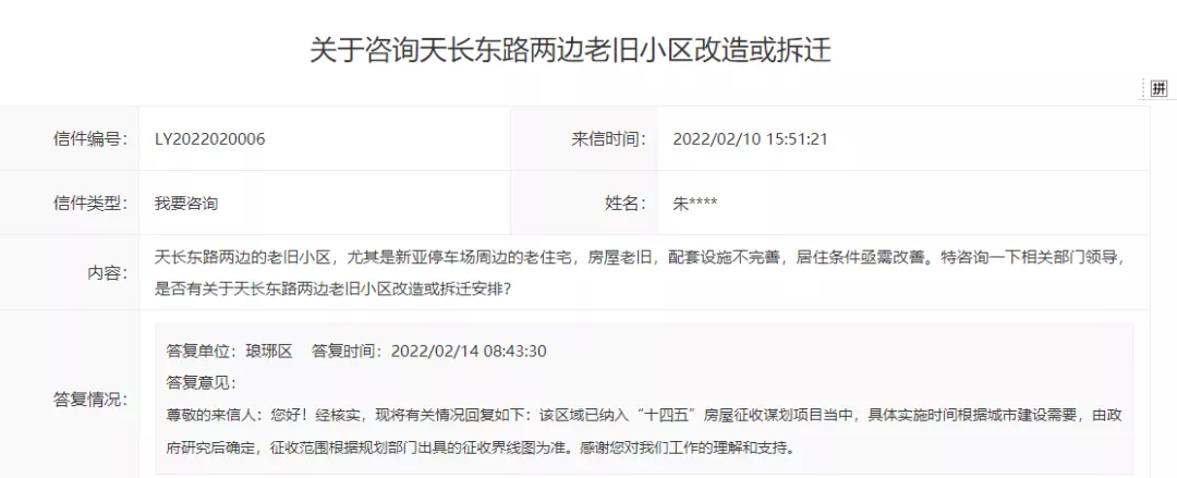 问:天长东路两边的老旧小区,尤其是新亚停车场周边的老住宅,房屋老旧,配套设施不完善,居住条件亟需改善。特咨询一下相关部门领导,是否有关于天长东路两边老旧小区改造或拆迁安排? 答:尊敬的来信人:您好!经核实,现将有关情况回复如下:该区域已纳入“十四五”房屋征收谋划项目当中,具体实施时间根据城市建设需要