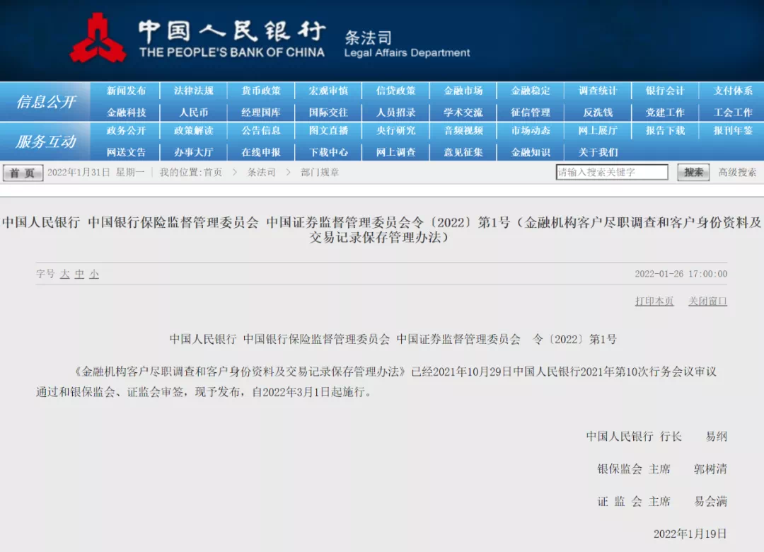 现行规定是2007年发布的《金融机构客户身份识别和客户身份资料及交易记录保存管理办法》(中国人民银行 中国银行业监督管理委员会 中国证券监督管理委员会 中国保险监督管理委员会令〔2007〕第2号),现行规定为: