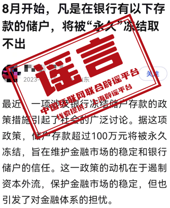 近日,有网传消息称“储户存款超过100万元将被永久冻结”。