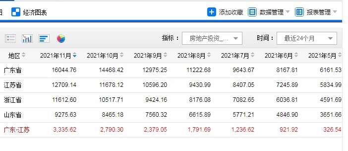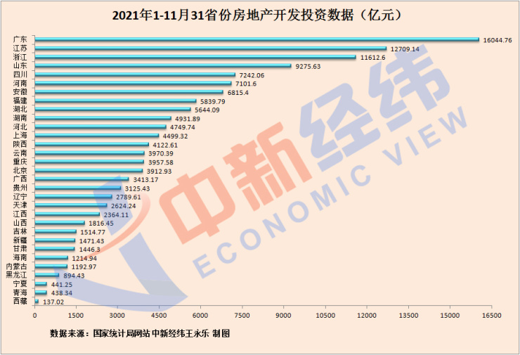 近日,国家统计局发布2021年1-11月31省份房地产开发投资数据。数据显示,今年前11个月,广东、江苏、浙江投资额均超万亿,15省份增速跑赢全国,湖北以全国增速的5倍领跑。