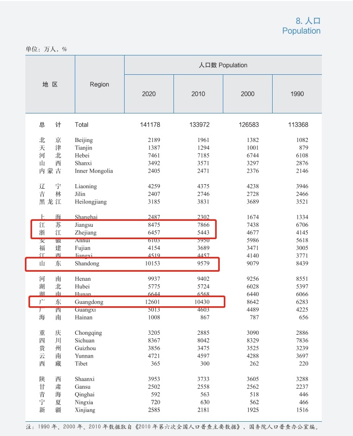 中新经纬注意到,上述四省份为近年来人口净增大省。七普人口数据显示,十年来,广东人口增加了2171万人,占全国人口增量的30.1%。江苏、浙江、山东人口分别增加609万人、1014万人和574万人,合计占全国人口增量的30.5%。
