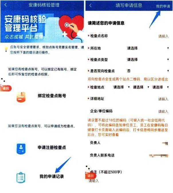 3.若已有管理账号,直接点击“绑定检查点账号”进入;若没有管理账号,可点击下方“申请注册检查点”,申请管理员账号,并根据实际情况,准确填写注册检查点的申请信息,提交等待审核。