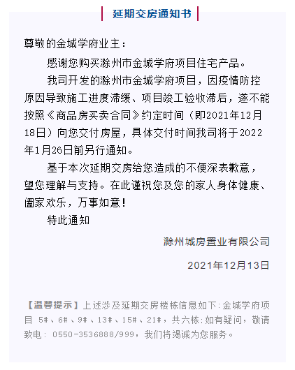 感谢您购买滁州市金城学府项目住宅产品。我司开发的滁州市金城学府项目,因疫情防控原因导致施工进度滞缓、项目竣工验收滞后,遂不能按照《商品房买卖合同》约定时间(即2021年12月18日)向您交付房屋,具体交付时间我司将于2022年1月26日前另行通知。