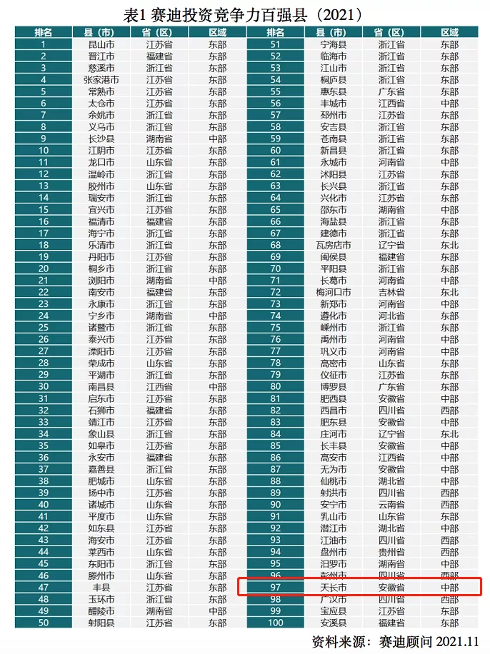 11月23日 工业和信息化部 中国电子信息产业发展研究院直属机构 赛迪顾问正式发布 《赛迪投资竞争力百强县(2021)》 在赛迪 投资竞争力百强县榜单中 安徽省投资竞争力百强县数量为5个 天长市 第97位 来源:天长发布