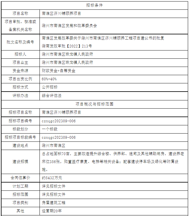 南谯区济川铺颐养项目招标公告信息建设地点:滁州市南谯区建设规模:总占地面积70亩,主要改造提升综合楼、供养部、连廊及其他辅助用房,建设养老床位356张,购置医疗康复、电梯等相关设备;配套建设停车场及绿化等附属…