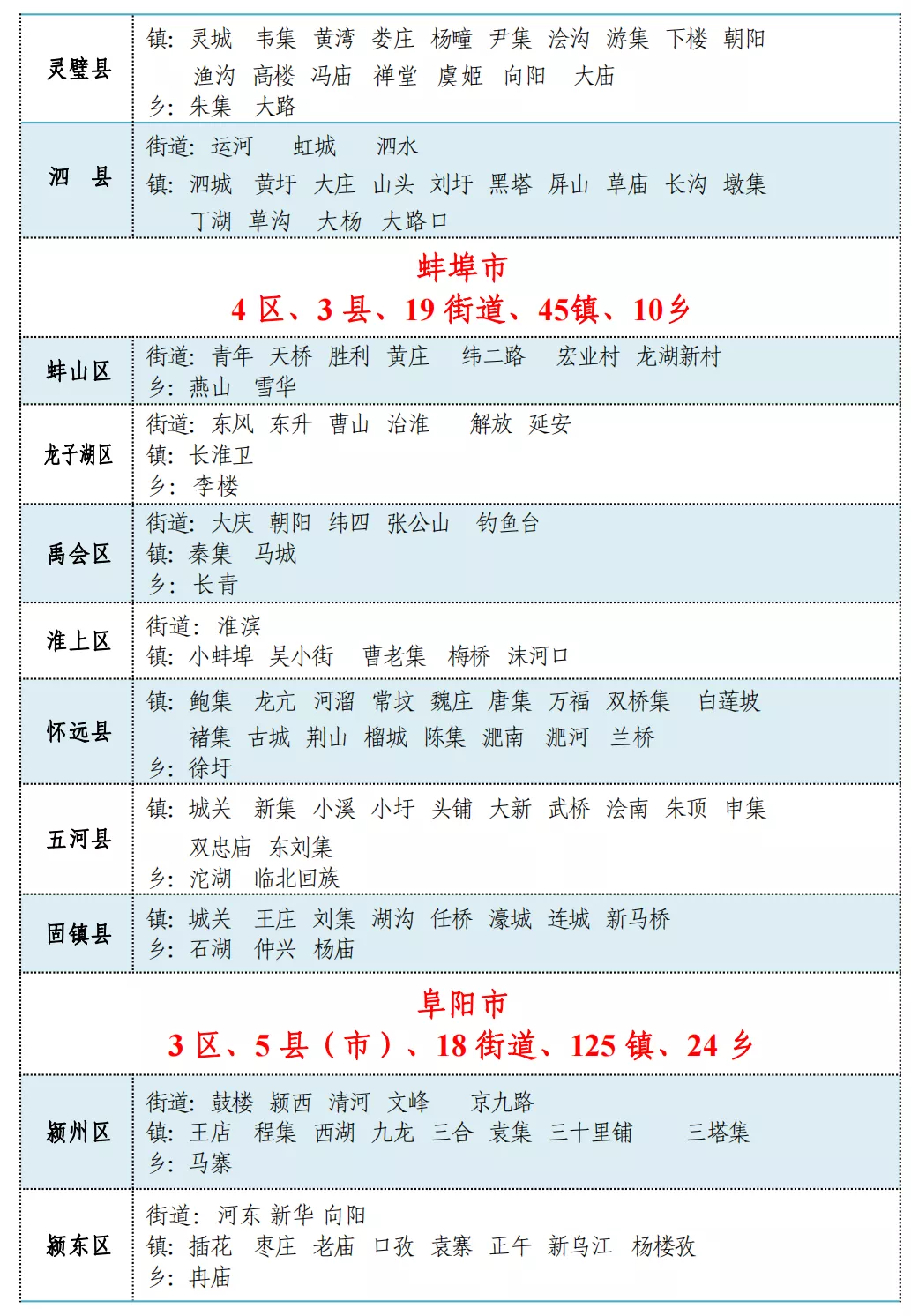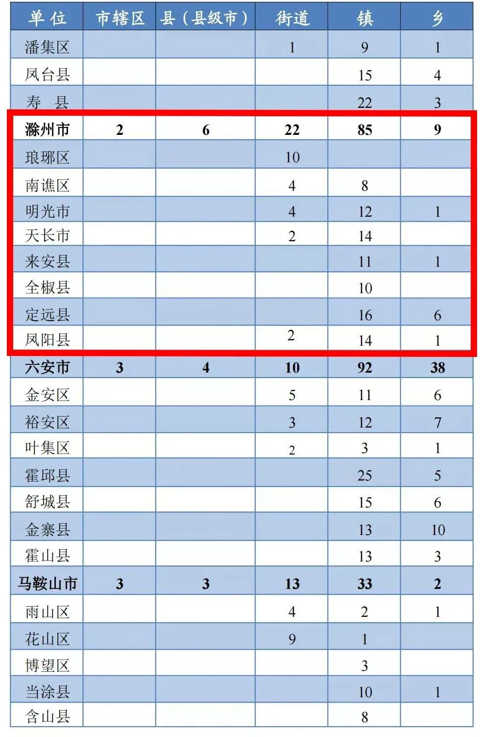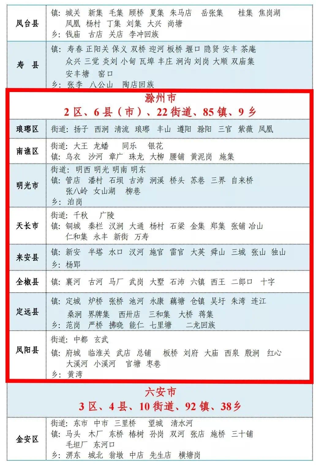 截至2021年12月31日,安徽有16个设区市、9个县级市、50个县、45个市辖区、276个街道、1236个乡镇。其中,滁州市有2个市辖区,6个县(县级市),22个街道,85个镇,9个乡。