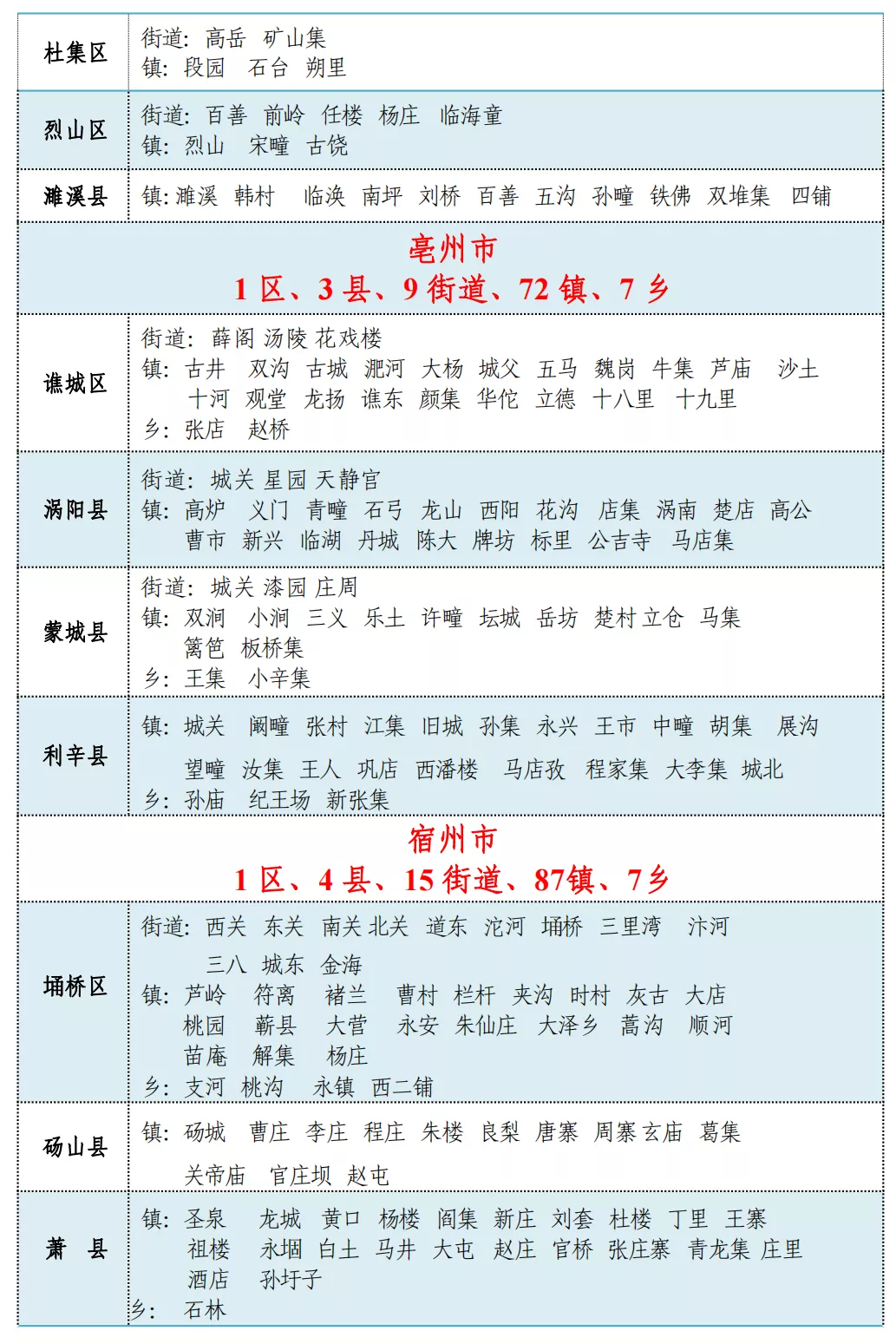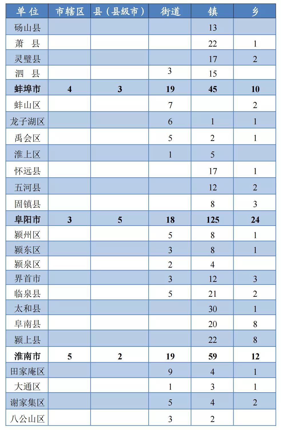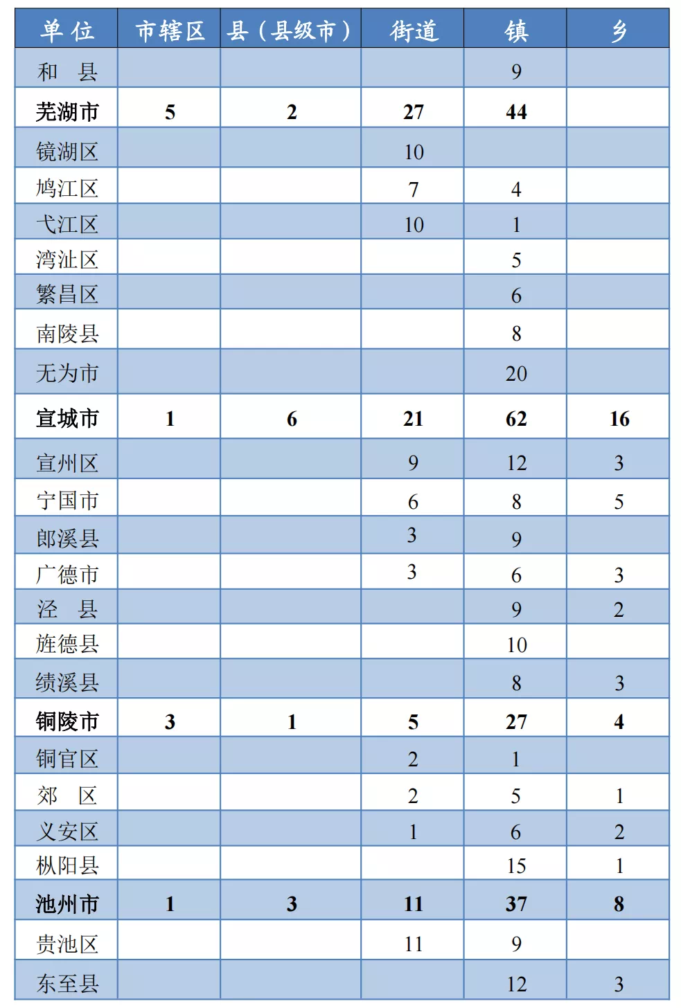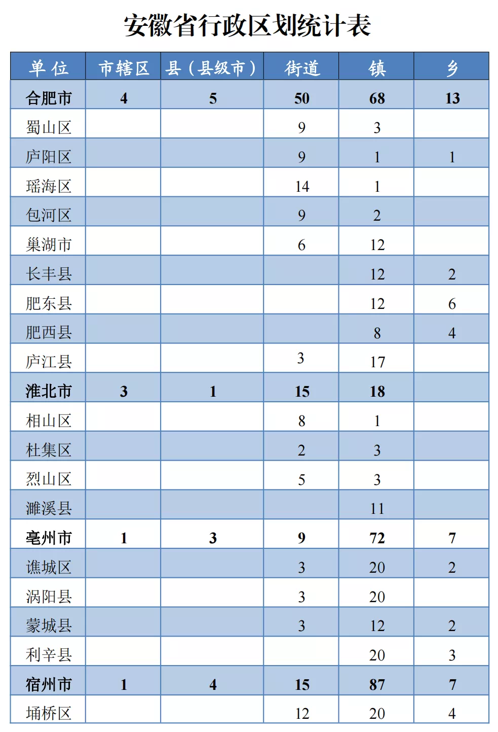 日前安徽省民政厅公布2021年安徽省行政区划简册 截至2021年12月31日,安徽有16个设区市、9个县级市、50个县、45个市辖区、276个街道、1236个乡镇。其中,滁州市有2个市辖区,6个县(县级市),22个街道,85个镇,9个乡。 来源:安徽省民政厅、