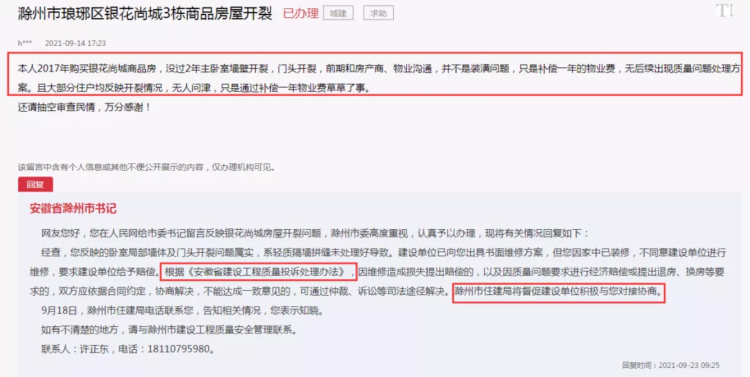 网友您好,您在人民网给市委书记留言反映银花尚城房屋开裂问题,滁州市委高度重视,认真予以办理,现将有关情况回复如下:
