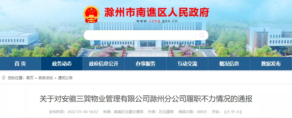 根据《安徽省物业管理条例》、《滁州市物业服务企业信用档案管理实施细则》相关规定,经研究,决定对安徽三巽物业管理有限公司滁州分公司进行通报批评,记不良记录一次,扣除年度信用档案分5分,建议同乐街道指导左岸香颂小区业委会、香颂名郡小区业委会和三悦澜山小区所属社区按规范征求小区业主意见,启动清退程序,通过合法途径重新选聘物业服务企业。望全区物业企业引以为戒,认真履职,加强管理,切实提高服务水平。