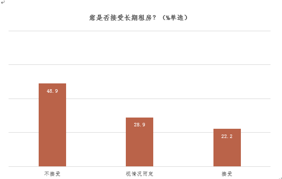 值得一提的是,我国新青年并不像国外那样,轻松接受租一辈子房子的想法,买房意愿依然非常强烈。《报告》显示,约48.9%的新青年受访者表示,不接受长期租房,其次约28.9%的受访者表示视情况而定。对于新青年,尤其是刚踏入社会的新青年,租房会成为排名前列选择。