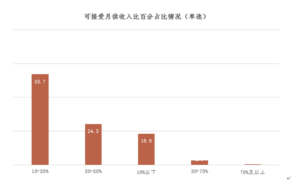 据《报告》显示,53.7%的受访者表示,可接受的月供收入比在10%-30%之间,其次是30%-50%的区间范围,占比约为24.3%。同时,30%以下占比达到72.3%。这也意味着,30%以下是多数受访者能够接受的月供收入比的区间范围,可以定义为“月供支出舒适线”;约96.6%受访者表示可接受的月贷款额占月总收入的比重在50%以下,据此可认为50%是家庭经济安全的界限,即安全底线。
