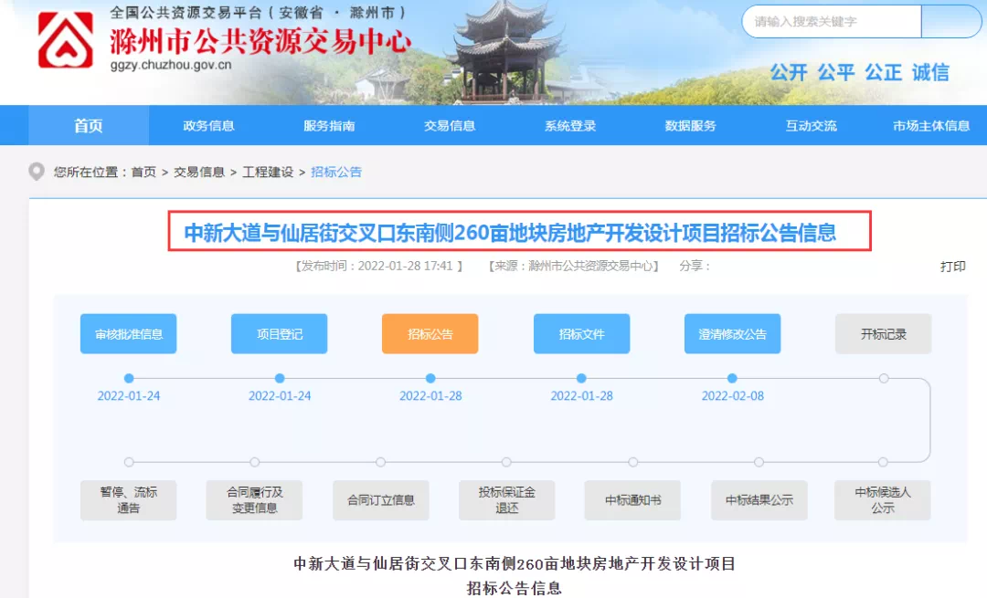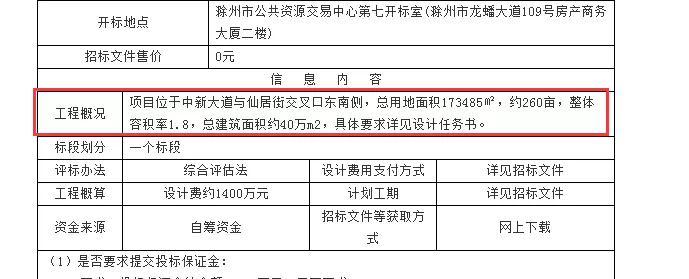 近日,滁州市公共资源交易中心发布《中新大道与仙居街交叉口东南侧260亩地块房地产开发设计项目招标公告信息》,城东这宗商住地块开发设计正式对外招标。