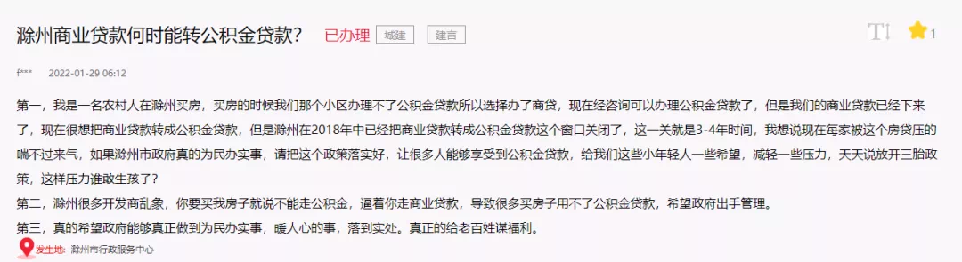 第二,滁州很多开发商乱象,你要买我房子就说不能走公积金,逼着你走商业贷款,导致很多买房子用不了公积金贷款,希望政府出手管理。