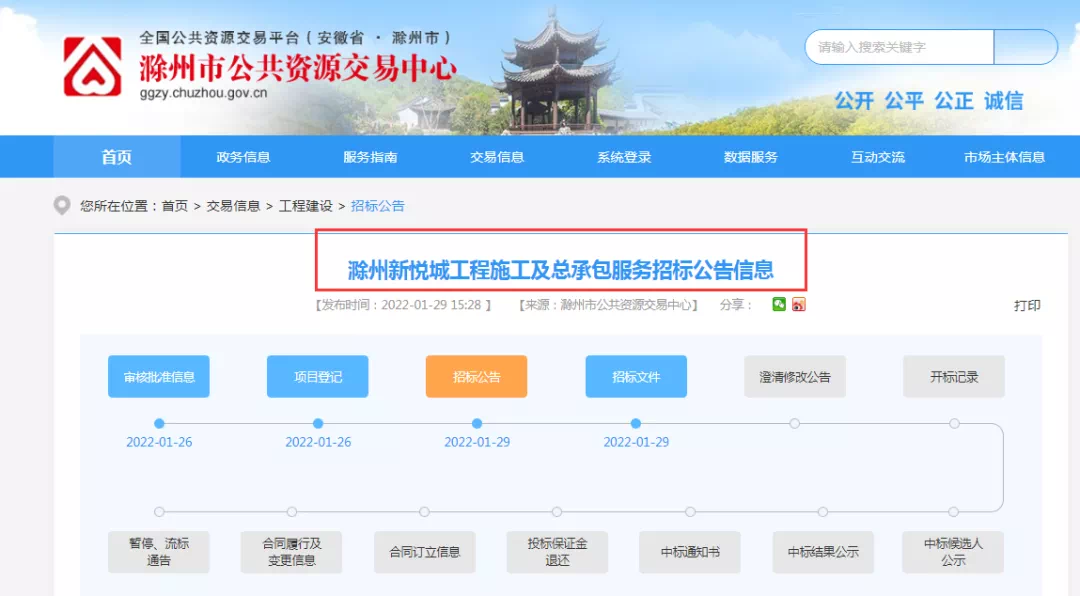 滁州新悦城项目位于滁州市清流路和黄山路交叉口,总建筑面积约31.11万㎡,住宅地块主要包括高层1-3#楼,5-13#楼,15-20#、P1-P5配电房、S1-S2商业,东大门、南大门、地下车库及附属配套等组成;商业地块主要包括商业改造、地上地下土建及内外装饰。总承包施工范围包括但不限于土方、基坑支护、基础及主体结构、粗装修、外墙保温、门窗、给排水、电气照明、人防(含防护防化设备)、地坪漆、太阳能、空气源热水器等。招标规模项目总投资约7亿元。