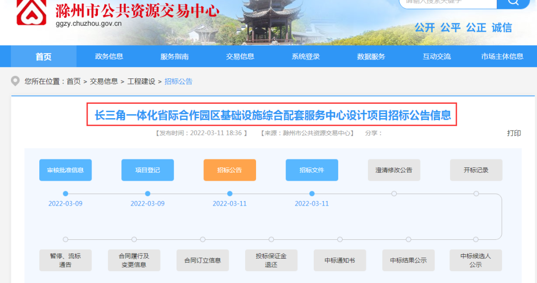 近日,滁州市自然资源和规划局发布《长三角一体化省际合作园区基础设施综合配套服务中心设计项目招标公告信息》。