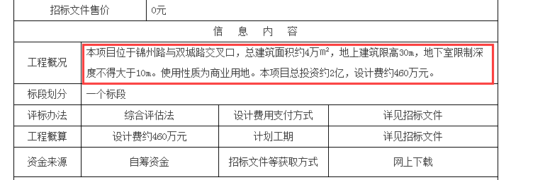 据了解,该项目位于锦州路与双城路交叉口,总建筑面积约4万㎡,地上建筑限高30m,地下室限制深度不得大于10m。使用性质为商业用地。本项目总投资约2亿,设计费约460万元。